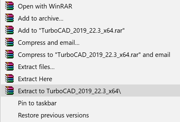 Extract it to desired location by Right-Clicking on the downloaded file and then choose Extract to TurboCAD_2019_22.3_x64.exe\.