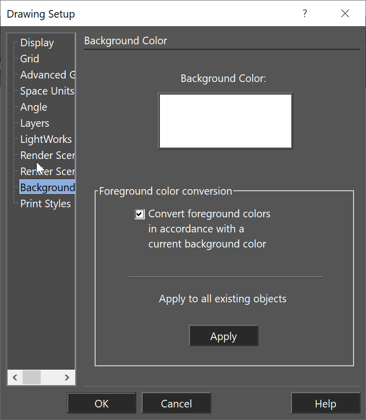 Options > Drawing Setup > Background Color and change the color White/Black according to your need.