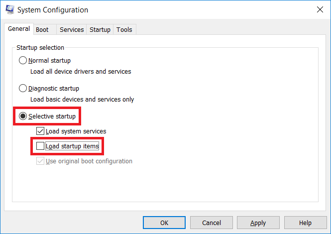 - Select Selective startup on the General tab and uncheck Load startup items;
